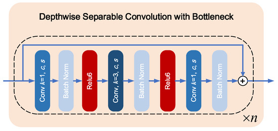 As shown in Figure 4, ReLU6 and batch norm are the activation function and batch normalization layer [52]. There is also a residual connection [53] in the DSCB to improve the learning efficiency. Several parameters control the structure of the DSCB: the expansion factor q, number of output channels c, number of repeats n, and stride s. The configuration of the simplified MobileNet is shown in Table 1. Compared with the original MobileNetV2, the structure of the simplified MobileNet has been optimized with only a few DSCBs, our model can obtain considerable anomaly detection performance and computational efficiency.