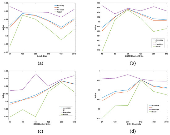 The influence of the parameters on the voltage-abnormal cell detection task. (a) The influence of the batch size; (b) the influence of the number of LSTM hidden units; (c) the influence of the number of CCH hidden units; (d) the influence of the number of channels in the CCH.