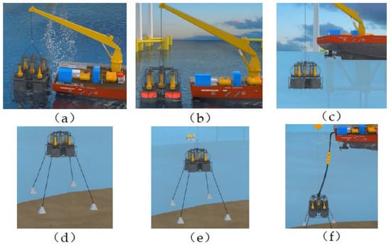 Installation procedure: (a) The device goes into the sea; (b) The device starts to regulate buoyancy; (c) The device sinks steadily; (d) The fixed anchor sinks into the seabed to fix the device; (e) ROV lifting cable; (f) Complete installation.