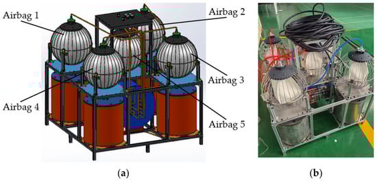 Parts of the structure of the experimental model of UWCA-FABESD: (a) The inflated airbags; (b) The interior of the control valve box in the physical model.