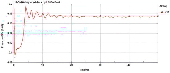Based on the above key data, a model of the airbag was established as shown in Figure 7a. The simulated airbag is shown in Figure 7b, and Figure 8 shows the pressure curve during the inflation process of the simulated airbag. Due to the external pressure set at 0.09 MPa, the final pressure of the simulated airbag should be 0.165 MPa, as shown in Equation (6). The curve shown in Figure 8 was obtained through simulation with the airbag pressure reaching 0.165 MPa as the termination condition.