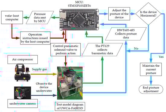 The experiment utilizes the STM32F03ZET6 microcontroller to receive the operation instructions from the upper computer VOFA+ and then converts the operation instructions into the switching sequence of the solenoid valve. The pressure sensor PT129 is used to collect the pressure data of the flexible airbag in the experimental device and send it to the MCU. The MCU processes the data and sends it to the upper computer for display and storage. Meanwhile, the six-axis gyroscope HWT605-485 (Purchased from Wit-motion Company in Shenzhen, China) can collect the posture data of the experimental device and send it to the MCU. The MCU uses its internal control algorithm to process the data and outputs the switching sequence instructions of the pneumatic solenoid valve that can adjust the positioning of the entire experimental device. This process is actually a fuzzy PID algorithm process; especially when the experimental device is sinking, it needs to continuously adjust its posture to keep the experimental device vertically descending.