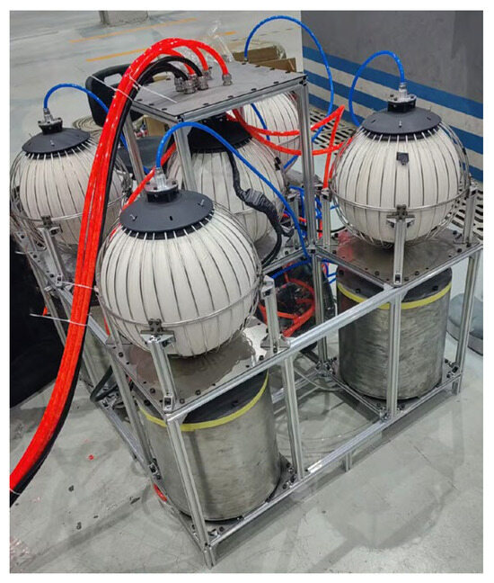 - A physical model designed with the same functionality as the engineering model can function properly. Adjustable ballast can adjust the posture of the UWCA-FABESD and its buoyancy and gravity ratio. The designed steel mesh cover of the airbag can protect the airbag while limiting its displacement and expanded shape. The device can store compressed air and release compressed air normally;