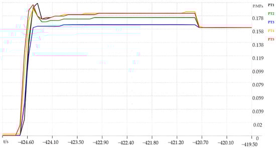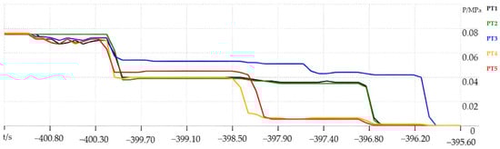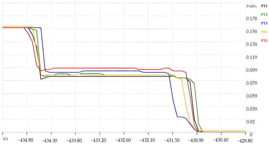 After the device was flushed on shore, the deflation test was carried out. Figure 12 shows the measured pressure curves inside the five airbags during the shore deflation process, the black PT1 curve corresponds to the pressure change inside the No. 1 airbag, the green PT2 curve corresponds to the pressure change inside the No. 2 airbag, the blue PT2 curve corresponds to the pressure change inside the No. 3 airbag, the orange PT4 curve corresponds to the pressure change inside the No. 4 airbag, and the red PT5 curve corresponds to the pressure change inside the No. 5 airbag.