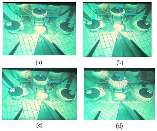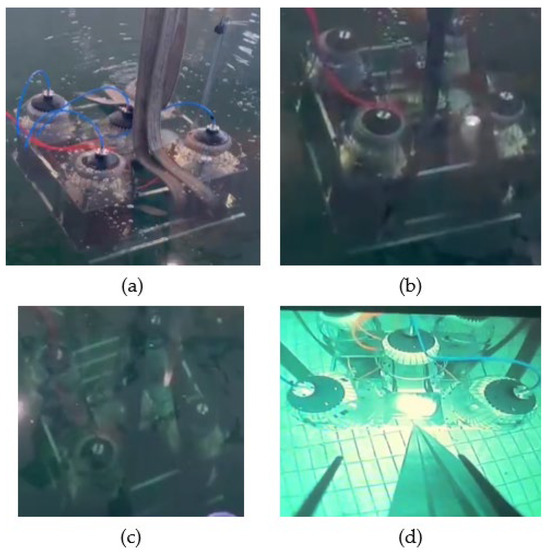 After completing the onshore inflation and deflation test of the airbag, the lifting and layout test of the UWCA-FABESD began. The entire experiment was conducted in a 10-m-deep pool, with a maximum load of 25 tons of aerial crane assisting. Figure 11 shows the experimental process. Place the device into the water tank. As the ratio of buoyancy to gravity is less than 1, the device will float on the water surface. Then, open the pneumatic butterfly valve at the bottom, and the water will enter the adjustable ballast. Bubbles will emerge from the bottom of the device and it will start to sink, as shown in Figure 13a. The device continued to sink until it was completely submerged in the water, as shown in Figure 13b. At this point, it was found that the device tilted to the bottom right corner, and the device began to adjust through the control algorithm and continued to sink. In Figure 13c, it can be seen that the device has been leveled, but the bottom right corner is not tilting. Wait for the device to continue sinking and touch the bottom. Through the underwater camera installed on the device, it can be seen that the device has reached the bottom of the pool, as shown in Figure 13d. From the moment the device touched the water surface to the point where it reached the bottom of the pool, the smoothest descent took 4 min and 49 s. Through this test, it can be seen that the adjustable ballast of the device can play a role in adjusting the posture of the device during the sinking process, so that the device can reach the predetermined position smoothly.