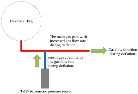 In the pressure curve of the airbag for underwater deflation, the pressure was basically stable at 0.8 MPa and outputted outward. After analysis, it was believed that the output pressure was smaller than the actual output pressure. The pressure of 0.8 MPa is not the actual output pressure, and the actual output pressure should be closer to the pressure at the beginning of deflation. The main reason for this situation is that the connection between the pressure sensor and the airbag is similar to a Venturi tube [30,31], as shown in Figure 17. When the gas starts to accelerate outward and output, the gas flow rate in the main gas path is greater than that in the sensor gas path. The gas in the sensor air circuit is sucked out, causing a decrease in the pressure detected by the sensor. After the flow rate of the main air circuit stabilizes, the detected pressure stabilizes at a small value. After the gas in the airbag is consumed, the pressure quickly drops to 0. Through this experiment, it can also be found that the working pressure of the UWCA-FABESD should also be the stable outward output gas pressure of the airbag, not equal to the air pressure inside the airbag.