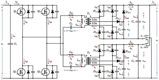 The circuit diagram of the proposed reconfigurable PSFB converter is shown in Figure 1. Two transformers are used, which have a primary winding and a secondary winding with a center tap connected to a CDD clamp circuit. An equivalent series inductance that represents an external series inductance added to the leakage inductance of the transformer is present in the primary sides. In addition, a blocking capacitor is added in the primary sides to eliminate DC current in transformers. The primary sides are connected in parallel and fed by an FB inverter. Each of the secondary sides is connected to an FB rectifier, a CDD clamp circuit and an LC output filter. Two auxiliary switches, and , connect the two secondary sides and enable series and parallel reconfigurations according to their switching states. When is kept ON and is maintained at OFF, the two secondary sides are connected in series. Conversely, when is kept ON and is maintained at OFF, the two secondary sides are connected in parallel.