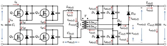 The proposed reconfigurable PSFB converter can be seen as equivalent to a traditional PSFB converter with a CDD clamp circuit, being either the series or parallel connection configuration. The equivalent circuit of the proposed reconfigurable PSFB converter is shown in Figure 2. Table 1 lists the equivalent circuit parameters.
