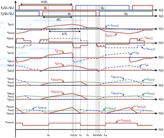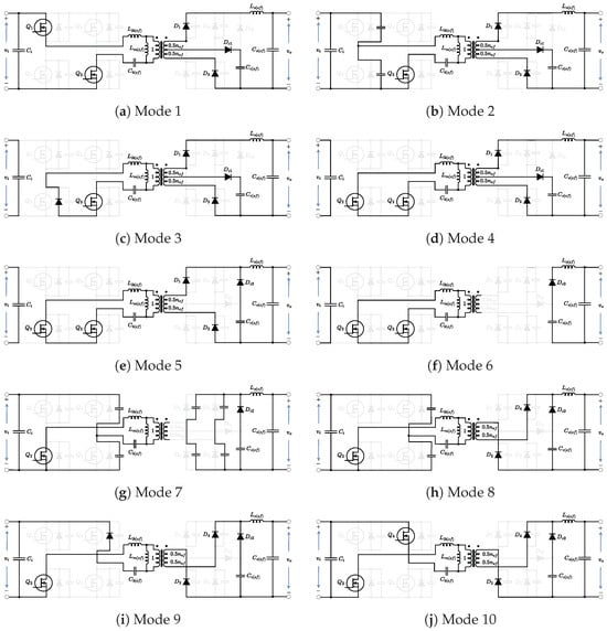 The control method is pulse-width modulation with phase-shift. Figure 3 shows the key waveforms of the equivalent circuit in Figure 2. Each switching period is divided into two half-cycles, where each half-cycle is subdivided into ten operation modes. Since the operation modes are symmetrical, only one half-cycle is analyzed. The equivalent operation circuits are shown in Figure 4. In order to analyze the operation modes, the following assumptions are made to simplify analysis: (1) The clamping capacitance is sufficiently large to be treated as a constant voltage source. (2) The output filter inductance is sufficiently large to be treated as a constant current source. (3) The blocking capacitance is sufficiently large to be treated as a negligible constant voltage source. (4) The transformer is ideal, except for its leakage inductance and magnetizing inductance . (5) MOSFETs – are identical and ideal, except for their output parasitic capacitances and body diodes. (6) The rectifier diodes – are identical and ideal, except for their junction capacitances. (7) The clamping diodes – are identical and ideal. (8) An external inductor is included into the leakage inductor . In addition, the following notations are described: and are the MOSFET voltage and current, and are the leakage inductor voltage and current, and are the transformer magnetizing voltage and current, is the rectifier diode current, is the clamping diode current, and are the clamping capacitor voltage and current, is the rectifier output voltage, is the blocking capacitor voltage, and and are the output filter inductor voltage and current, is the effective duty cycle and d is the duty cycle.
