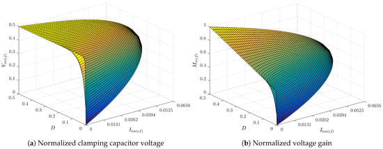 The relationship surfaces of and according to D and are illustrated in Figure 5. An increase in reduces the available operating range of and to their limiting value of 0.0656. Conversely, a decrease in increases the available operating range. However, smaller values and narrower variations of D are required to guarantee a wide operating range of the converter.
