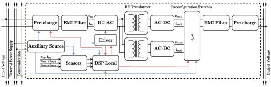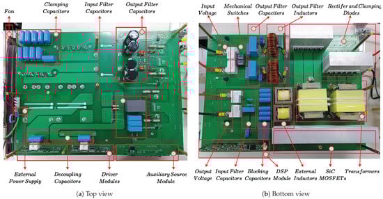Figure 8 shows the test scheme of the prototype. High-voltage pre-charge circuit-based IGBTs were developed and used to manage the inrush current. EMI filter circuits were developed and used to suppress conducted EMI noise. An auxiliary source module-based DC–DC switching regulator IC was developed and employed to provide various voltage levels required by different components. Driver module-based Si8285 ICs were developed and used for driving SiC MOSFETs with safety features. Finally, a DSP module-based TMS320F280037C DSP core was developed and employed for signal conditioning, communication and implementation of digital control algorithms.