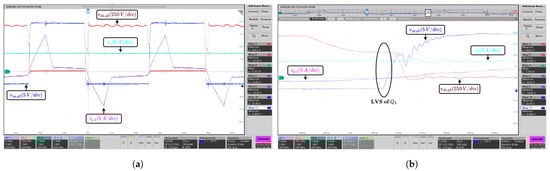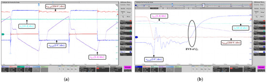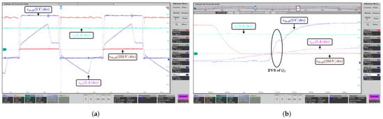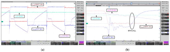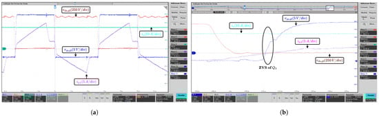 Parallel connection case: experimental waveforms in the leading leg under full load condition. (a) Waveforms of the drain-source voltage and gate-source voltage of switch , primary current , and output current . (b) ZVS waveforms.