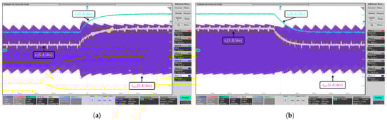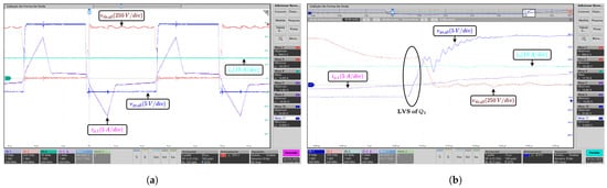 The experimental tests are performed at different power and voltage levels. Figure 9 and Figure 10 show experimental waveforms in the leading and lagging legs under full load condition ( A) for the parallel connection case. As shown in Figure 9a and Figure 10a, the proposed reconfigurable PSFB converter regulates well the output current with . Moreover, as can be seen in Figure 9b and Figure 10b, the ZVS turn-on operation is achieved. Under half load condition ( A), the experimental waveforms in the lagging leg are shown in Figure 11. Figure 11a shows that the output current is regulated with . Furthermore, Figure 11b shows that the lagging leg fails to achieve the ZVS operation; however, the low voltage switching (LVS) operation is performed.