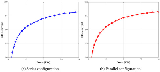Figure 17 shows the measured efficiency of the prototype for the series and parallel configuration. The measurement did not consider the external power supply or external circuits used in the test scheme. As shown in Figure 17, the prototype has a high efficiency in a wide load range, achieving 96.69% under full load conditions.