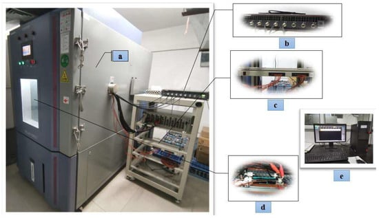 Test experiment platform: (a) programmable constant temperature and humidity test chamber, (b) precision battery tester, (c) battery test system auxiliary channel, (d) battery fixture, (e) monitoring system.