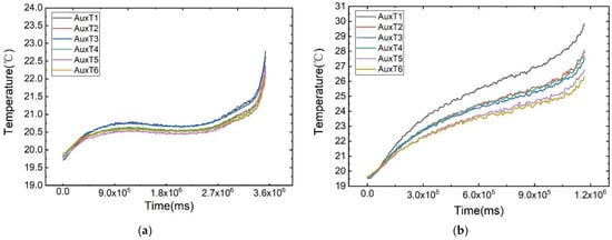 As illustrated in Figure 6, the temperature change curves of each measurement point under different discharge rates at an ambient temperature of 20 °C are displayed. The battery’s surface temperature rises rapidly at the beginning and end of discharge, attributed to the polarisation phenomenon. During the voltage plateau phase, the temperature increase is more gradual. Notably, the plateau phase is more pronounced at lower discharge rates due to its prolonged duration.