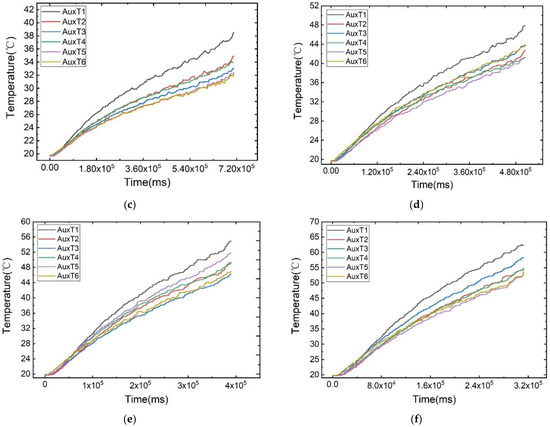Temperature variation curves of the cell surface at different discharge rates: (a) 1 C, (b) 3 C, (c) 5 C, (d) 7 C, (e) 9 C, (f) 11 C.