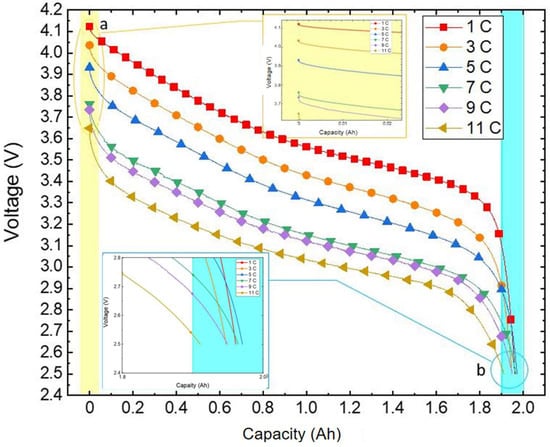 As shown in Figure 8, the voltage–capacity change curve of the lithium-ion battery during discharge is illustrated. The yellow-filled section indicates that a higher discharge rate in an identical temperature setting results in a quicker drop in initial end voltage and a lower discharge plateau. This phenomenon occurs because at lower room temperature the active material inside the battery becomes insufficient to fully participate in the reaction, reducing the electrolyte’s ionic conductivity. As a result, the resistance of the SEI film and electrochemical reaction increases. With an escalating discharge rate, the ohmic, electrochemical, and concentration polarisations intensify, causing a rise in voltage loss. Consequently, the voltage sharply declines at the onset of discharge.
