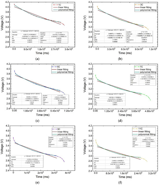 By comparing the linear fit and polynomial fit curve equation coefficient of determination R2 parameters, it can be found that the voltage–time polynomial fit curve equation decidability factor R2 is greater than the linear fitting linear equation coefficient of determination R2 at different discharge rates, and the polynomial fitting accuracy is higher than the linear fitting accuracy.
