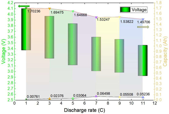 As shown in Figure 10, the voltage and capacity variation interval of the plateau period when the discharge is performed at different rates at an ambient temperature of 20 °C is plotted. When the 1 C discharge was performed, the voltage of the platform period dropped from 4.098 V to 3.373 V in the process, the battery capacity was discharged from 0.00761 Ah to 1.70236 Ah, and a total of 1.69475 Ah capacity was discharged, accounting for 86.45% of the total discharged capacity; when the 3 C discharge was performed, the voltage of the platform period dropped from 3.966 V to 3.228 V in the process, and the battery capacity was discharged from 0.02376 Ah to 1.66176 Ah, with a total capacity of 1.638 Ah, accounting for 84.11% of the total discharged capacity; when the same 5 C, 7 C, 9 C, and 11 C discharges were performed, the batteries discharged 1.64668 Ah, 1.53247 Ah, 1.53822 Ah, and 1.49706 Ah, respectively, accounting for 83.47%, 78.03%, 78.95%, and 78.42% of the total discharged capacity, respectively. The specific voltage change and capacity change during the voltage plateau period are illustrated in Figure 10. The green bar graph represents the voltage change, while the coloured portion illustrates the discharged capacity change. It is evident that with a lower discharge rate at the same temperature, a higher percentage of total capacity is discharged during the voltage plateau period. This results in less damage to the battery and ultimately extends its lifespan.