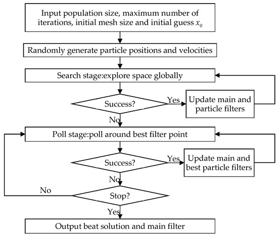 PSO-MADS is a typical hybrid optimization algorithm that couples the particle swarm optimization (PSO) [41,42] algorithm with the mesh adaptive direct search (MADS) [43] algorithm, belonging to the class of global–local stochastic search algorithms. It combines the global optimization capability of PSO with the local optimization capability of MADS. The PSO-MADS algorithm benefits from the global search provided by PSO and the local search provided by MADS. The algorithm switches between PSO and MADS based on specific conditions and settings, as shown in Figure 2.