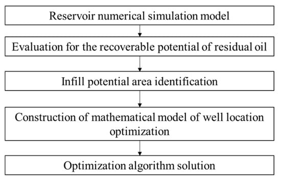 Flowchart of infill well location optimization method based on remaining oil recoverable potential evaluation.
