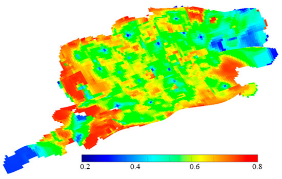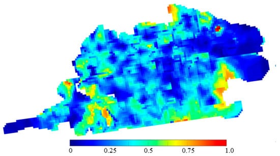 The remaining oil recoverable potential index of each grid unit is calculated using Equation (22), which can comprehensively characterize the influence of the reservoir’s physical properties, recoverable reserve abundance, and oil–water diversion capacity in different regional positions on the remaining oil production potential in the ultra-high water cut stage. Then, the remaining oil recoverable potential map of the NmIL sand body in the ultra-high water cut stage is drawn, as shown in Figure 6.