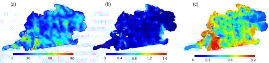 Distribution map of evaluation indicators in main layer NmIL. (a) Unit conductance coefficient, (b) unit remaining oil dominant potential abundance, and (c) oil cut of each grid unit.