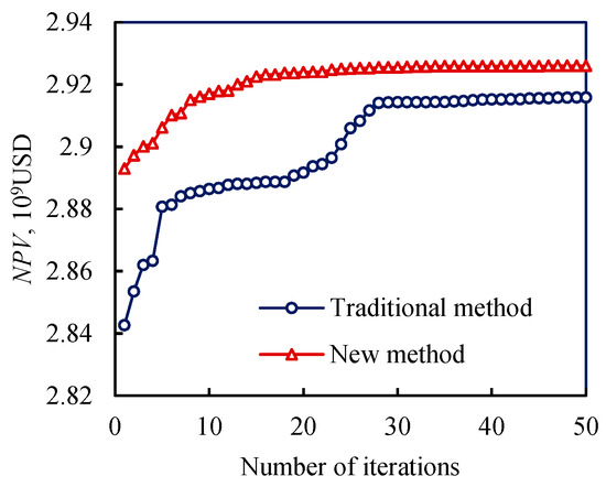 To analyze the difference between the remaining oil potential-based infill well optimization method and the conventional infill well optimization method in terms of the development effect, this section adopts the conventional infill well optimization method and the new method, respectively. The conventional infill well optimization method means that the infill well location is optimized throughout the reservoir. Based on the analysis of the remaining oil potential, the new method determines the region with encryption potential and then optimizes the region. As shown in Figure 7, the average iteration curve obtained using the two methods is that the initial infill well location of the conventional method is randomly given within the reservoir range, while the initial infill well location of the new method is given within the range of potential for infill. Therefore, the NPV obtained using the initial scheme of the two methods is different, and the NPV obtained using the new method is higher than that of the traditional method.