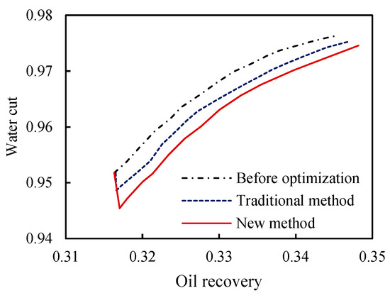 The relationship curves of water cut and oil recovery before and after optimization are shown in Figure 8. It can be seen that when the same water cut is reached, the oil recovery after optimization is higher than that before optimization, and the development effect of the target block is improved. Moreover, the reservoir development effect can be improved greatly by using the infill well location optimization method based on the remaining oil potential.