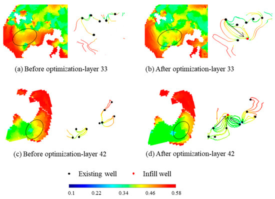 Residual oil saturation and streamline distribution before and after optimization (Black circles represent the comparison areas).