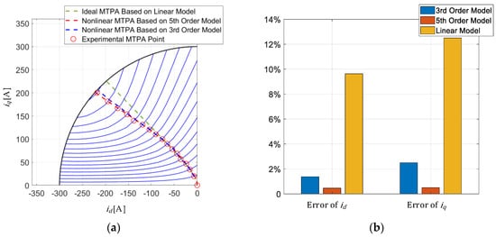 Figure 2a shows the MTPA trajectory of the conventional and improved nonlinear criteria in comparison to the experimental results. The conventional MTPA trajectory in Figure 2a is derived based on Equation (13), in which and are determined at the no-load condition. The experimental MTPA trajectory in Figure 2a is determined by the manually searching method. The details of the manually searching method are provided in Section 4.3. To compare the effect of different orders of the polynomial fitting model on the current trajectory, Figure 2a shows the results of current trajectory based on the third-order polynomial fitting model and the fifth-order polynomial fitting model, respectively.