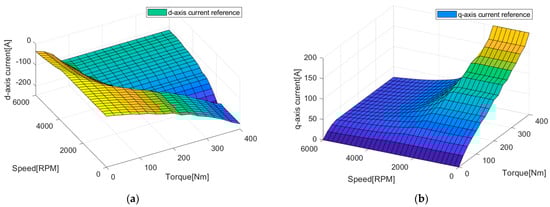 The current reference LuT, corresponding to the different torque commands, can be calculated for the whole speed range based on the improved MTPA criteria (25) and MTPV criteria (32) proposed in this paper, as well as the torque Equation (19), the current-limit Equation (9), and the voltage-limit Equation (11). The workflow and calculation algorithm for the current reference LuT were performed according to [15]. Figure 4 shows the results of the calculation. As can be seen in the figure, the current reference covered the whole speed and torque region, and the transition between the MTPA, FW, and MTPV regions was smooth.