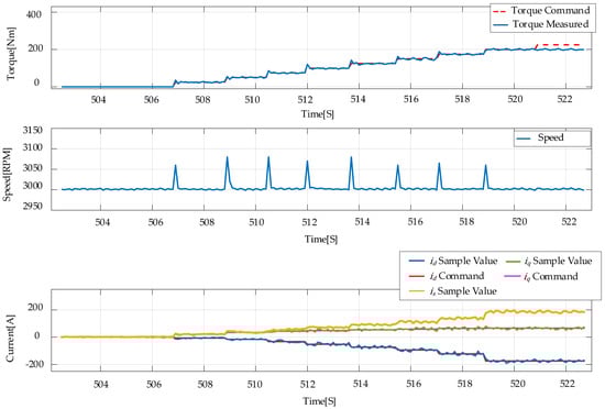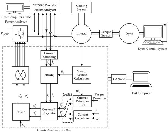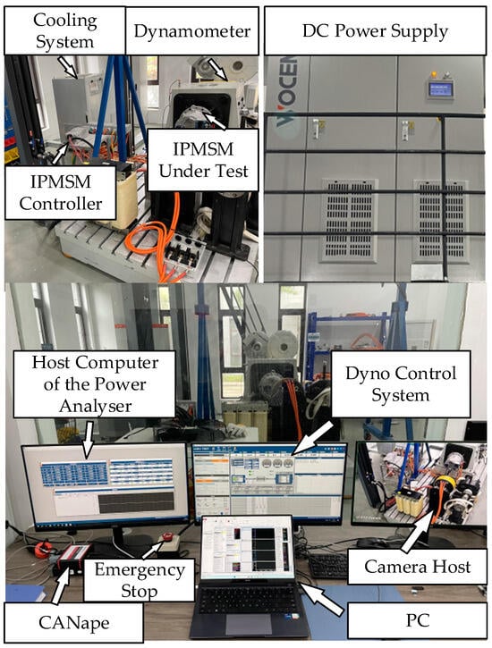 Figure 5 and Figure 6 show the schematic diagram and the photograph of the experimental platform. The experimental platform comprises a 200 kW AC asynchronous motor from Wuxi Langdi Measurement and Control Technology Co., Ltd. (Wuxi, China), which serves as a dynamometer, and the IPMSM under test. The two machines were mechanically coupled together with a torque sensor placed in-between. The dynamometer was in speed control mode, with its speed being regulated by a host computer control system. The IPMSM under test was in torque or current-control mode and was driven by a commercial inverter/motor controller supplied by VEPCO Technologies Inc (Los Angeles, CA, USA). The controller is based on the TC377, a 32-bit AURIX™ microcontroller from Infineon Technologies AG (Neubiberg, Germany). The verter/motor controller is responsible for regulating the current and torque of the IPMSM under test according to the FOC algorithm, which consists of algorithmic modules, such as a complex vector current regulator, current reference LuT, dead-time compensation, and feed-forward decoupling voltage compensation. When the flux-linkage model identification experiments were performed, this controller was in current-control mode, and the d- and q-axis current command values were directly determined by the given stator current amplitude and current angle. When the nonlinear criteria validation experiments were performed, the controller was in torque-control mode and the current command value was obtained from the torque command through the current reference LuT. The data in the current reference LuT were calculated from the improved current criteria. The communication and data transfer between the motor controller and the host software was realized through CANape 17.0, a CAN bus tool developed by Vector Informatik GmbH (Stuttgart, Germany). MATLAB R2024a was employed for the graphical analysis of experimental process data exported from CANape. The Yokogawa WT5000 Precision Power Analyzer (Yokogawa Electric Corporation, Tokyo, Japan) was used to monitor and calculate the voltage and current during experiments. The temperature of the inverter and IPMSM was regulated and maintained by a liquid-cooling system. The DC power supply from the Shandong Wocen Power Equipment Co., Ltd. (Jinan, China) provided the bus voltage for the test bench. Table 2 presents a summary of the principal equipment utilized in the experimental platforms.