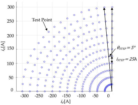 Based on the above principle, the flux-linkage model can be calculated for various combinations of and by scanning the amplitude and angle of the stator current within the current limit. The sweep test points are shown in Figure 8.