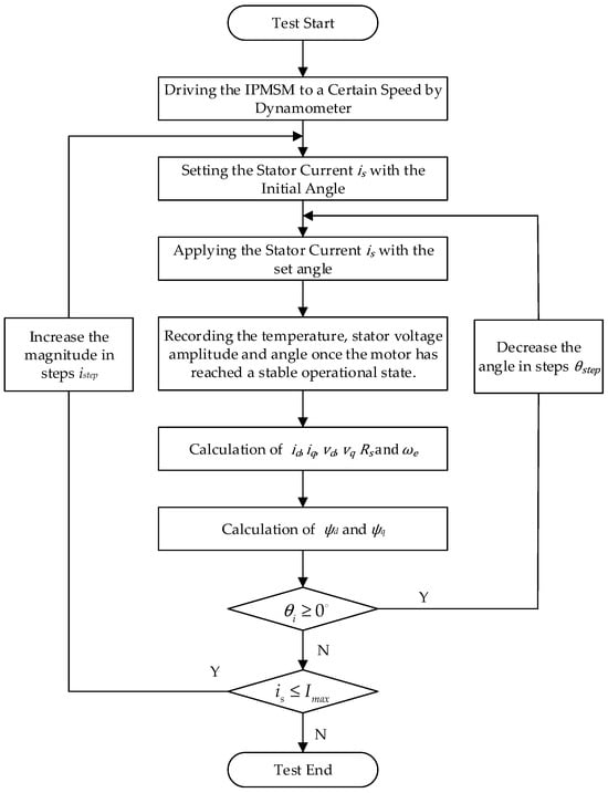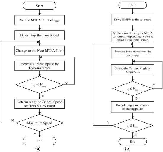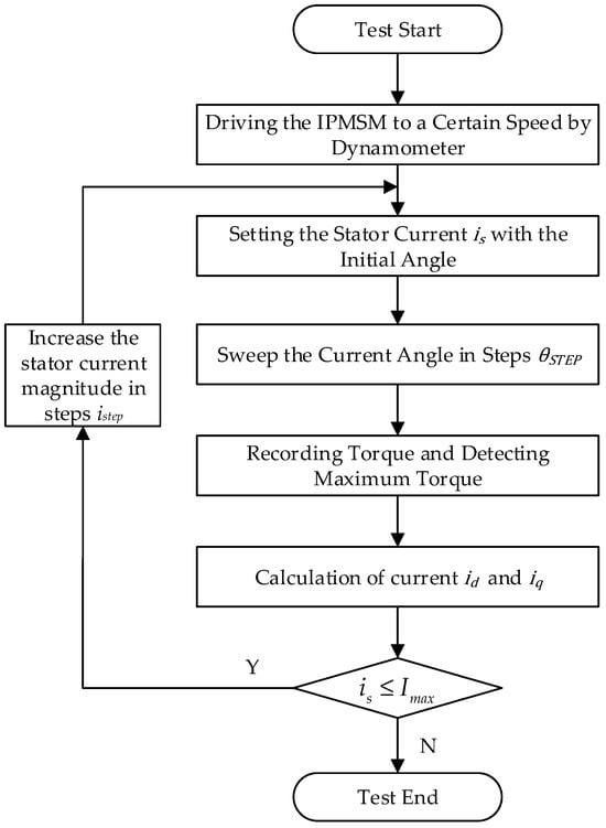 Figure 10 shows the flowchart for the experimental identification of the MTPA current trajectory, and Figure 11 is the related vector diagrams. Similar to the experimental identification of the flux-linkage model, the IPMSM was first driven by the dynamometer to a speed lower than the base speed. Then, a stator current with amplitude was applied to the IPMSM, which had an initial angle of 90°. Following this, the current angle was then decreased in step from 90° to 0°, while the motor output torque was monitored by the host computer and the current angle corresponding to the maximum output torque was recorded, so that the MTPA operating point for this stator current condition was determined. After this process, the stator current amplitude was increased in step and the angle sweep process was repeated until the stator current amplitude reached the current limit.