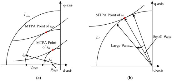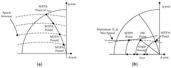 Based on the constraints of the inverter voltage and current, the operation of IPMSMs can be classified into two or three regions depending on the motor speed [5]. In order to achieve the output performance of IPMSMs in different speed regions, a well-designed motor structure and appropriate control methods are required. Field-oriented control (FOC), also known as current vector control (CVC), is a motor control method based on currents that can be directly measured. It is widely used in electric vehicle drives due to its high algorithmic maturity and low computational complexity [6,7]. FOC indirectly controls external characteristics, such as the torque and speed of IPMSMs, by manipulating the component of the stator current vector in the rotor field-oriented rotational frame (d-q reference frame). Based on the mathematical model of the motor developed in the d-q reference frame, FOC can visualize the operating characteristics of IPMSMs, inverter voltage-, and current-limiting conditions as a set of equation curves in the d-q current plane [7]. For each load torque requirement, there is an infinite number of current operating points in the d-q current plane that satisfy the load condition. Depending on the motor speed, different control strategies can be used to determine the optimal current operating point that satisfies the current/voltage constraints and operating conditions [8]. At low speeds, the maximum torque of the motor is mainly determined by the current-limiting conditions. An ideal control strategy for this condition is to achieve the maximum output torque per unit of motor current, thus increasing the output torque and reducing motor losses. The control strategy can be referred to as MTPA control. The different current operating points determined by the MTPA control strategy are plotted as the MTPA current trajectory [9]. In the high-speed region, the motor’s maximum torque is determined by both the current- and voltage-limiting conditions. The current operating point determined by the field-weakening (FW) control strategies can weaken the magnetic field of the permanent magnets, thereby reducing the motor’s back electromotive force. This expands the motor’s speed range while maintaining control stability [10]. Subject to voltage limitations, the range of operating points is varied for different speeds of the IPMSM. The maximum torque per volt (MTPV) current trajectory can be plotted by summarizing the current operating points at which the IPMSM can yield the maximum electromagnetic torque at different speed conditions [11].
