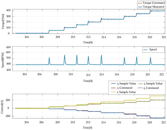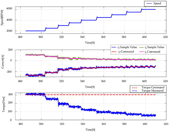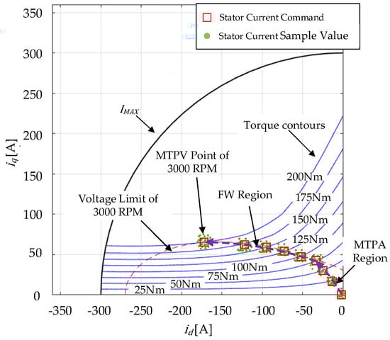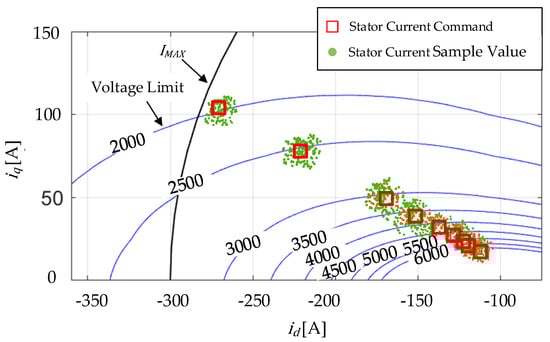 As shown in Figure 3a, the differences between the linear MTPV trajectory and the nonlinear MTPV trajectory were relatively small when the speed was close to the maximum speed of the motor, and both were consistent with the experimental MTPV points. This is because in the high-speed region, the amplitude of the stator current was relatively small due to the constraint of the voltage limit. Therefore, the magnetic saturation phenomenon was relatively insignificant. However, when the motor speed was relatively low, the difference between the linear MTPV trajectory and the nonlinear MTPV trajectory increased, and the linear MTPV trajectory deviated from the experimental MTPV points. Figure 3b shows the motor torque of the current operating points determined for different MTPV criteria at 2000 RPM and 2500 RPM. The torque difference, , between the nonlinear MTPV criteria and the linear MTPV criteria was 23 Nm at 2000 RPM, and this torque difference decreased with increasing motor speed.