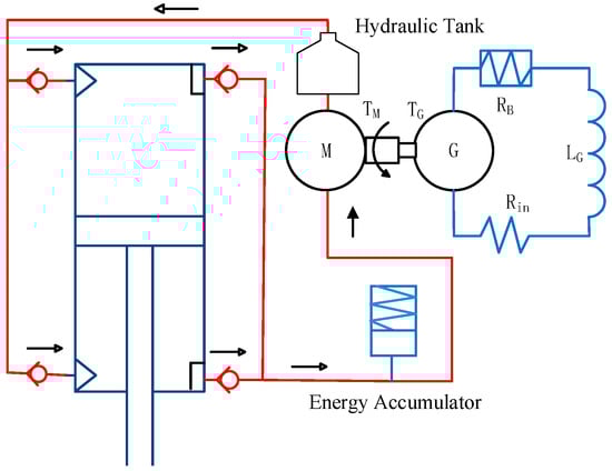 This study focuses on the classic hydraulic–electrical regenerative damper model [26]. As shown in Figure 1, the hydraulic–electrical regenerative damper comprises several key components: a hydraulic cylinder, a hydraulic rectifier bridge, an accumulator, a hydraulic motor, a hydraulic tank, a generator, and associated piping. When external excitation is applied to the system, the piston within the hydraulic cylinder initiates reciprocal motion. During this process, high-pressure oil is expelled from the hydraulic cylinder and directed through the hydraulic rectifier bridge, which ensures unidirectional oil flow. Once rectified, the oil is stabilised by the accumulator before entering the hydraulic motor, where it drives rotational motion. The oil tank can replenish hydraulic oil and reduce losses during this process. This rotation subsequently powers the generator, converting mechanical energy into electrical energy. This sophisticated energy conversion mechanism not only facilitates the recovery of vibrational energy but also transforms it into usable electrical power. The generated electricity can then support onboard electronic equipment, thereby enhancing the overall energy efficiency of the system. This approach leverages the inherent motion of the train to generate electricity, offering a sustainable solution to power onboard systems without additional energy input. Furthermore, by stabilising the hydraulic fluid through the accumulator, the system ensures consistent performance and reliability. The integration of these components into a cohesive system demonstrates the potential for significant advancements in power regeneration technologies within the rail transport sector, promoting both operational efficiency and environmental sustainability.