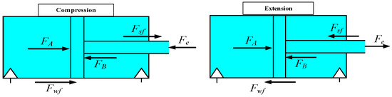 The damping force generated by the hydraulic cylinder during both the compression and extension strokes can be analysed through the main force diagram shown in Figure 2. During these strokes, the damping force, denoted as and , respectively, results from the resistance encountered due to the relative motion between the cylinder components.