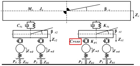 Since the carbody exhibits pitch motion, the force provided by the primary suspension regenerative damper (PSRD) must be accurately characterised without altering other vehicle components. The dynamic interaction between the PSRD and the carbody involves complex force distributions that account for both vertical and rotational movements. The force provided by the PSRD can be expressed as follows: