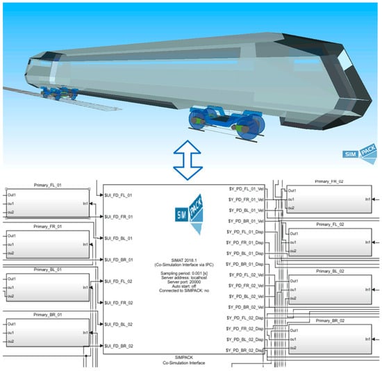 In this study, a regenerative damper numerical model and a vehicle–track coupled dynamics model were established using MATLAB and SIMPACK interface, respectively. Co-simulation was achieved through the utilisation of SIMAT, allowing for seamless integration of the two platforms. Additionally, a typical high-speed train model was developed for comparison, as illustrated in Figure 4. The modelling approach employed a substructure technique for both wheelsets and bogies. This method enabled detailed representation of the dynamic interactions within the vehicle system. Based on the parameters of bogie components presented in Table 4, a comprehensive vehicle dynamics model was constructed. This model comprised one carbody, two bogies, four wheelsets, and eight axle boxes. The wheel–rail contact dynamics were simulated using the FASTSIM algorithm, which provided accurate representation of the contact forces and their influence on vehicle behaviour.