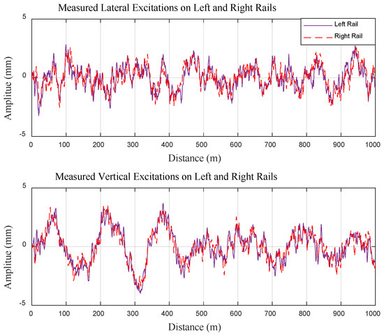 Track irregularity is the principal source of excitation for vibration dampers, and different track excitations significantly influence the vibration attenuation and power generation performance. To ensure that the research aligns closely with real-world conditions, this study utilises measured track irregularity data from a specific railway in China as the track spectrum, as shown in Figure 5. Applying actual track irregularity data ensures that the analysis reflects real operational conditions providing a realistic assessment of the damper’s performance. It also allows for a direct comparison of the regenerative damper’s performance with that of conventional primary vertical dampers, highlighting the regenerative damper’s advantages in terms of vibration reduction, wheel wear reduction, and power regeneration.