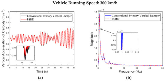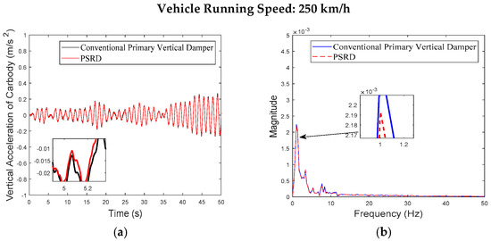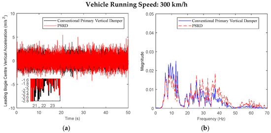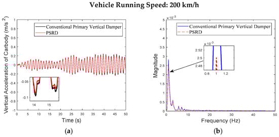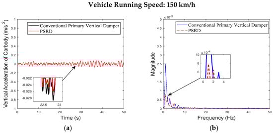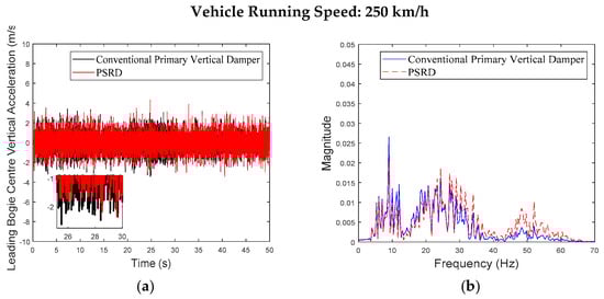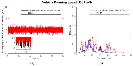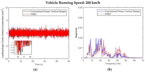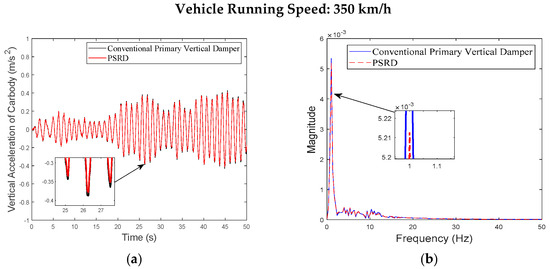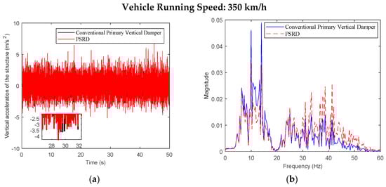 - At a constant speed range of 150–350 km/h, increasing in increments of 50 km/h, the time and frequency domain responses of the carbody and bogie vertical accelerations and damper travel of the PSRD vehicle closely align with those of conventional primary vertical damper vehicle. Notably, the vertical acceleration amplitude slightly increases between 20 Hz and 60 Hz. The increase is attributed to the pressure time-varying nonlinear components in the PSRD, deviating from ideal linearity and causing fluctuations in speed inputs at both ends of the damper.