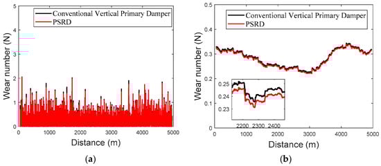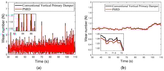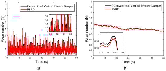 The comparison between the conventional primary vertical damper-based vehicle model and the integrated PSRD vehicle model, as shown in Figure 21, Figure 22 and Figure 23, reveals a consistent trend in their instantaneous wear indices. Notably, the wear index of the integrated PSRD vehicle model tends to demonstrate a slightly lower magnitude compared to that of the conventional primary vertical damper vehicle model. The finding suggests that the proposed PSRD design and functionality can contribute to reduced wear between the wheel and rail interfaces. Furthermore, an analysis of vehicle operation at various speeds, including constant speed, acceleration, and deceleration, indicates a variable trend in wear work with changes in velocity. The dynamic behaviour underscores the complex interplay between vehicle dynamics, track conditions, and operational parameters, all of which influence wear patterns and energy dissipation within the wheel–rail interface. By comparing the RMS values of wear, the PSRD vehicle model shows lower wear numbers than its conventional counterpart. These findings have significant implications for rail infrastructure maintenance and cost management. By potentially reducing wheel–rail wear, the PSRD could contribute to extending wheel–rail service life and lowering maintenance expenditures over the long term. The simulation results provide valuable insights into the effectiveness of the proposed PSRD design in mitigating wear-related challenges in railway operations.