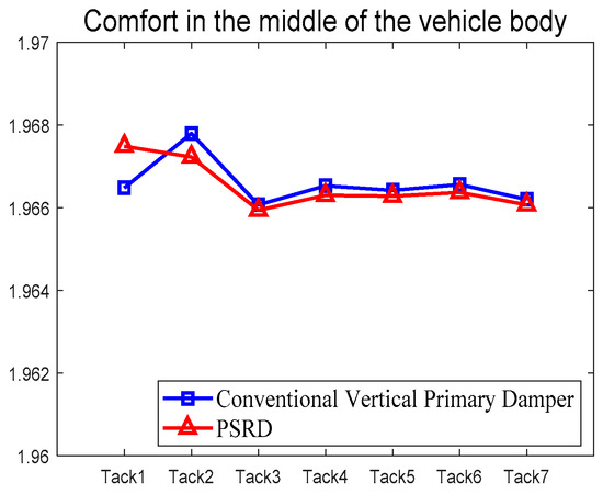 Table 7 presents the ride comfort assessment based on the 95th percentile weighted RMS acceleration (mean ride comfort) under different track conditions. As shown in Figure 24, the ride comfort indices show a consistent trend across various track scenarios, indicating the effectiveness of the PSRD system in maintaining passenger comfort.