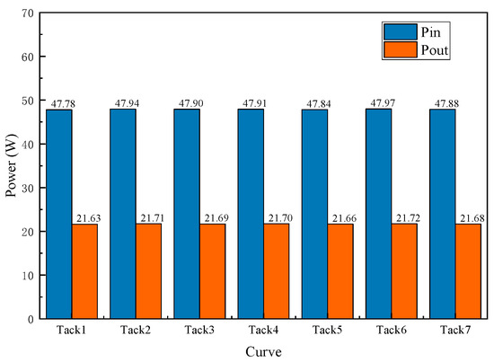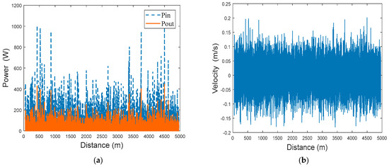 To investigate the power regeneration and efficiency of regenerative dampers, simulations were conducted at a vehicle speed of 350 km/h. The simulations were based on real-world conditions of a 5 km railway line in a specific region of China, as detailed in Table 6. The simulation results, shown in Figure 25 and Figure 26 and Table 8, provide a comprehensive analysis of the power generation capabilities and efficiency of the regenerative damper system under high-speed operation. The findings offer valuable insights into the practical application and performance of the PSRD in real-world scenarios, highlighting their potential to enhance power regeneration and improve overall system efficiency.