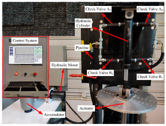 Based on the schematic in Figure 1, the parameters of the key components are listed in Table 2. A corresponding test rig was designed and fabricated according to the design concept and model development principles (Figure 27) to validate the predictions of the developed PSRD model. The test bench was equipped with essential components of the PSRD system, including a hydraulic cylinder, spring-loaded accumulator, hydraulic motor, generator, check valves, and piping, to facilitate accurate data collection and ensure thorough evaluation of the system’s performance.
