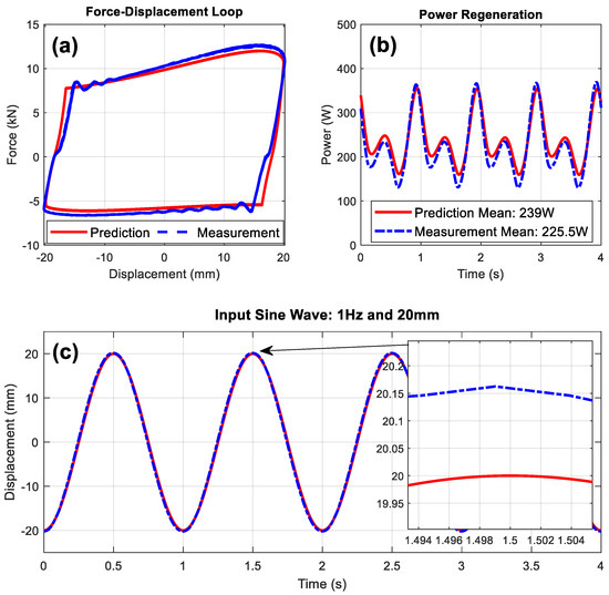 The validation of (a) force–displacement loop, (b) regenerated power, and (c) input sine wave excitation.