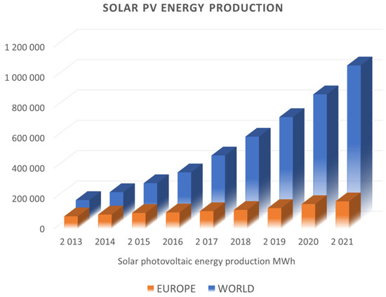 The progress of civilisation, particularly technical civilisation, is inextricably linked to the production and subsequent consumption of energy. In general, the final form of energy for human use is mechanical, electrical, and thermal energy and light. This is of quite practical importance to mankind, as this makes it possible to perform work with capacities far in excess of those available in the form of human and animal muscle power. The acquisition of energy is based on the use of physical exo-energetic processes, such as the combustion of fuels and the subsequent conversion of the resulting heat into mechanical and then electrical energy. Unfortunately, in the face of society’s ever-increasing energy needs, conventional energy processes have reached such a scale that they have begun to pose a real threat to our natural environment, which may even result in irreversible climate change in the form of pollution of the ecosphere as well as a fateful rise in the average temperature of the atmosphere [1]. This state of affairs has necessitated attention to methods of energy generation which have minimal impact on the planet’s environment. These are commonly referred to as renewable energy sources (RESs) and include solar energy (photovoltaics and solar panels), wind energy, energy from the movement of water masses, and geothermal energy (heat of the earth). Photovoltaics (PV) plays a special role in the use of renewable energy sources. It uses energy directly from the Sun to generate electricity. It is highly environmentally friendly as it does not pollute the atmosphere or raise temperatures [2], and the equipment can be operated for a long period of time (25–30 years). The growth in the installed renewable energy capacity worldwide and in Europe over the last 10 years is illustrated in the graph (Figure 1). The following graph (Figure 2) shows the amount of energy produced by PV systems, for comparison, worldwide and in Europe.